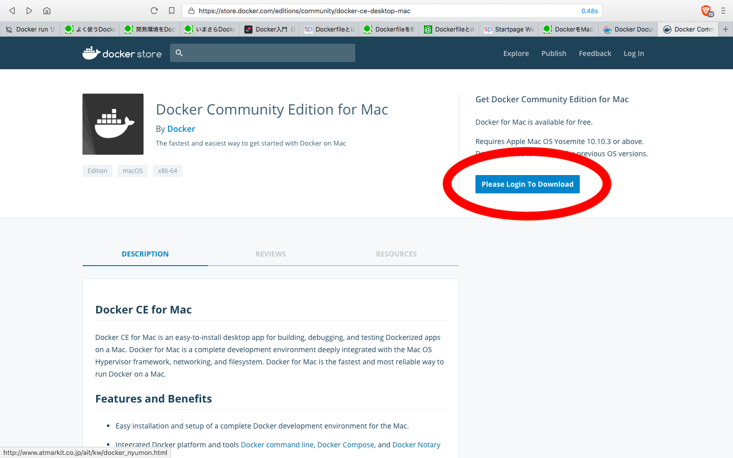Dockerアプリケーションのインストール手順は下記になります。下記はMacbook向けの「Docker for Mac」のインストールの仕方です。