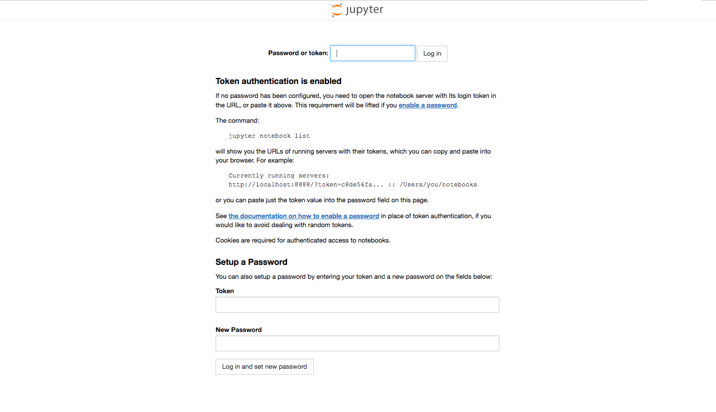 $ docker logs notebookこの状態でブラウザからJupyter notebookにアクセスしてもトークンというランダムな文字列を求めてくるため、logsコマンドからトークンを番号を確認します。