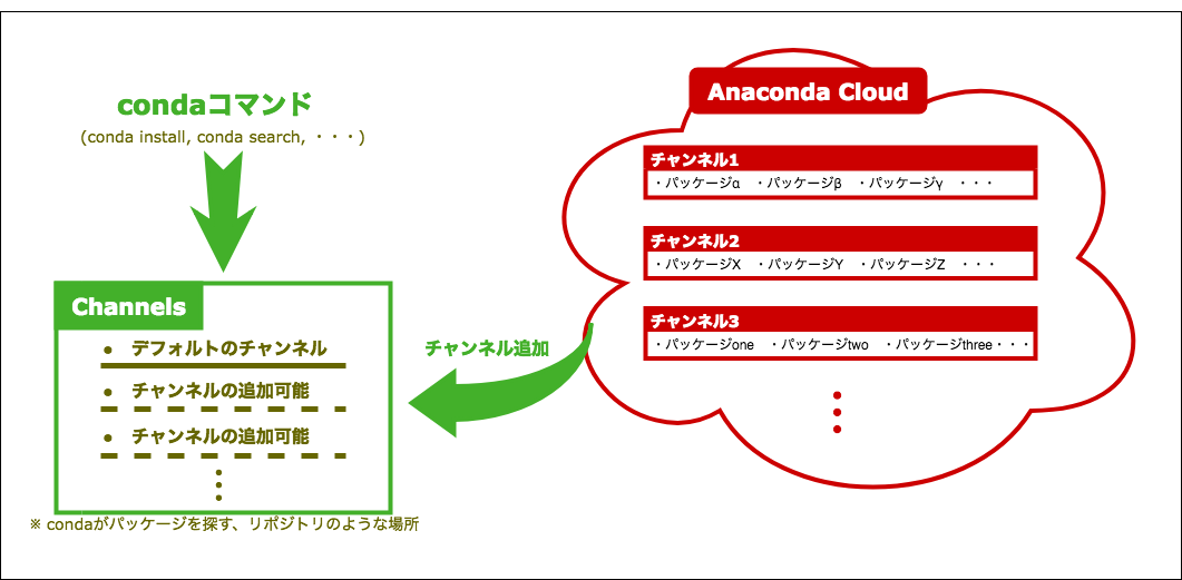 - condaにはデフォルトのチャンネルが存在するが、新たにチャンネルを追加することもできる
